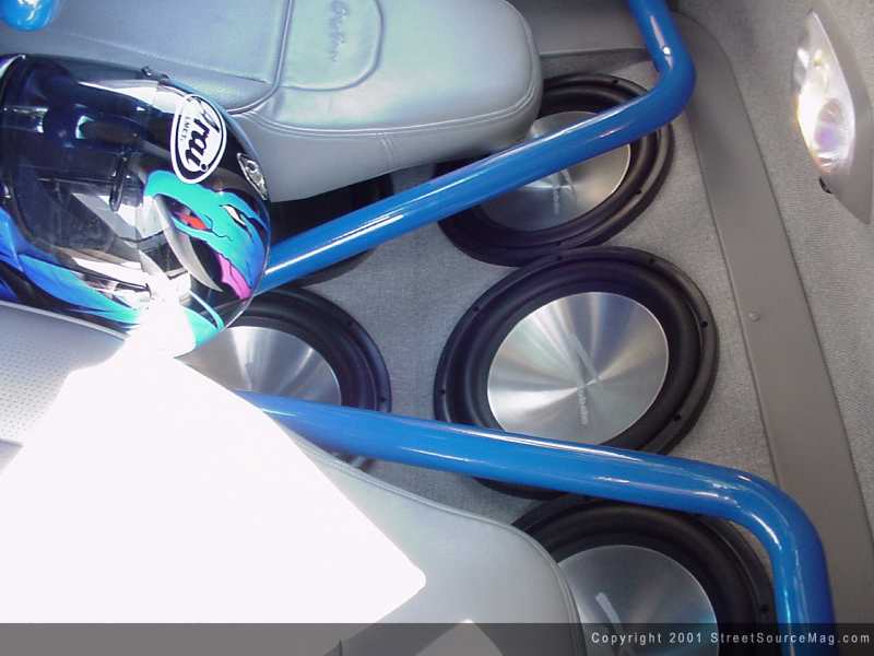 To finish off the interior, Trent had a roll cage made by Ruben and Drew of Monkeybars. The full roll cage was powder coated blue for added looks. Finally, to finish off the modifications to the interior, Trent was now ready to work on the audio and video of his Explorer. A Clarion double din MAX2256 CD and cassette player with monitor, along with a Clarion 6-disc changer, was used as the starting point. Trent then went with an Audiobahn 30 band EQ to help balance the sound throughout the Explorer. Three Audiobahn amplifiers were used to push the sound through the series of speakers. One was used for the six 12-inch Audiobahn Aluminum subs, one for the mid-bass in the front doors and the final one is a four channel, used to help the high end. All of the mids and highs are mounted in kick panels amongst the door panels and floor. To help bring out the bass, an Audiobahn bass booster was installed.