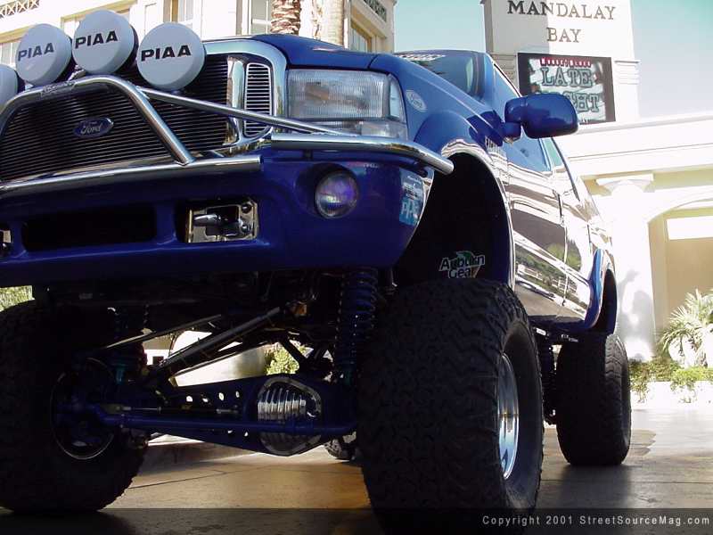 To change the overall appearance of this monsterous Excursion, John changed many things. Starting with the front, John went with a Trenz billet grille. Next, John took the stock front bumper, smoothed it out and frenched in a set of PIAA lights. To help the mean off road look of his ride, a Reaper Racing Banshee light bar was installed. To provide a clean look, Auto Indulgence super whites where installed.  Working his way back to the rear, a set of Bush Walker fender flares where mounted up.