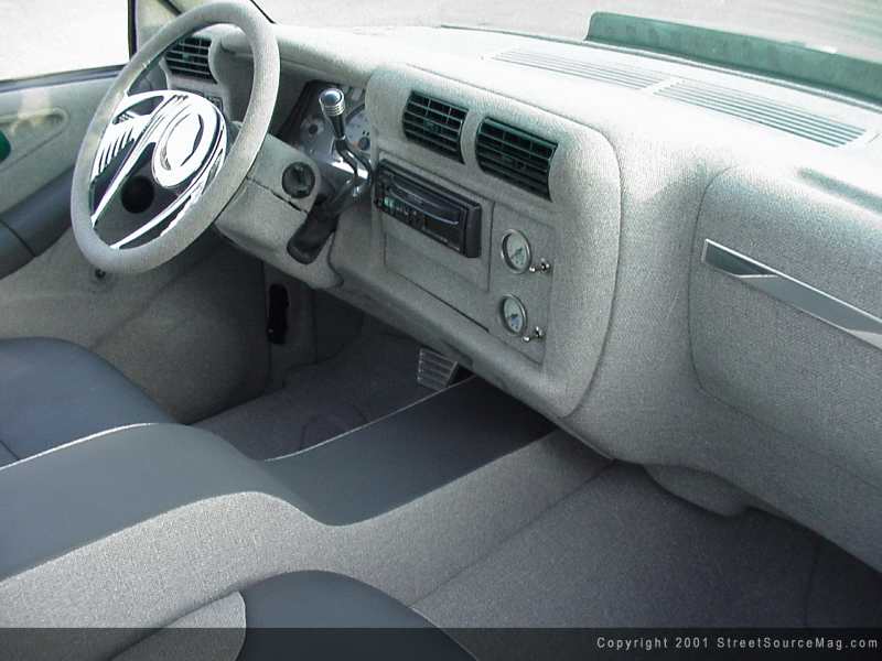 Brandon McDonald of Lebanon, Tennessee went to work giving Jason's interior a completely new look. First, Brandon removed the dash and rewrapped it in gray tweed and then reinstalled it before removing the headliner, door panels, and all other interior panels and rewrapping them in gray tweed and leather. Brandon next removed the factory seats, removed the headrests and rewrapped them in gray tweed. Brandon also installed a set of APC white face gauges, billet oval rearview mirror, and capped it off with a Psycho steering wheel from Billet Specialties.