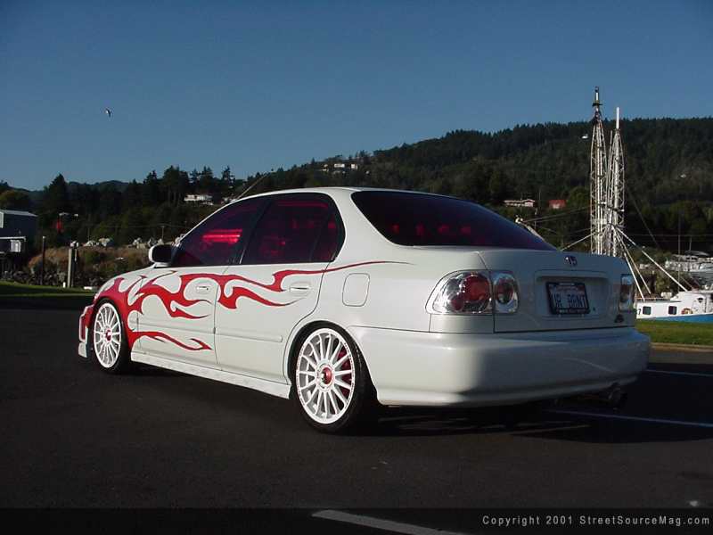 Now having the car just about complete, the two decided that being an import and all they would need to put a little work into the engine bay. For starters the plug wires where ditched for a set from MSD. To help the engine spool up for better performance, an AEM Cam Gear along with AEM pulleys where installed. Helping the engine breathe with the new additions, a DC sport ceramic header with 3" custom exhaust would be installed topped with a polished Can muffler.