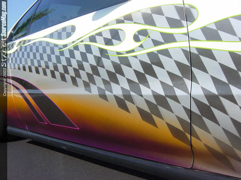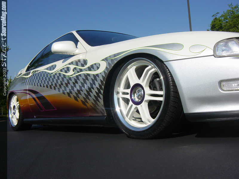 When you first see her car across the show field or rollin' down the road, you'll notice that it's not your average Prelude. The factory paint was sanded down and the door handles and emblem holes were welded up to make room the new custom paint job. Summer wanted a paint job that would be wild enough to impress the best judges, yet clean enough to not be too much. She chose a white base with a few shades of silver, orange and purple. She also had a fading checkerboard wrapped all the way around the car mixed in with white tribal flames