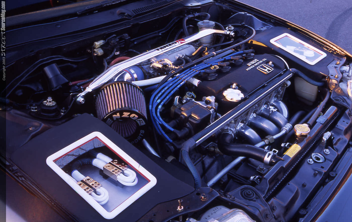 With Randy having previously worked on an Acura Legend which he competed and won numerous IASCA titles in the 90's, it was the decision after a long conversation with Chad at the 1999 consumer electronics show that it was time to build yet another dominating ride. The first car he would send Chad was not in the best of shape so the decision was to sale it, which they did and purchased a new one that, was in much better shape. With Chad being an installer at Soundworks it would be easy to rework any of the wiring stereo and video needs they would deem necessary for this project. With all intentions of this ride being built for stereo, the ensure us that much more engine and exterior modifications will come later on this year. Starting with the engine, all factory wiring in the engine bay was rerouted to where it was pretty much invisible.