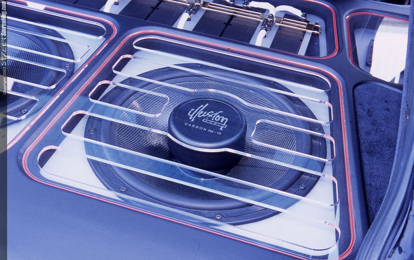With the installation in place, it was time to keep things from rattling and to keep the sound in. To manage this 4 layers of dynamate were applied to the custom wrapped headliner. Next the rear quarter windows were rebuilt out of wood and fiberglass along with being rewrapped in black velvet. This was not only done for looks but to help stop unwanted reflections. To help tie things together, the tops of the doors were refinished in black velvet along with the floorboard. Next a set of custom floor mats with read and black stitching would be developed and set inside along with an Ichiban steering wheel. | The subwoofers have a unique laser cut plexiglas design for added eye candy. | With a little over 1000 hours in the installation of the newfound stereo and interior confines and cost close to $45,000, it was time to work the exterior.The exterior would stay pretty simple the first time around. With a set of Skunk Works Coilovers along with Tokiko struts and Tenzo Sway bar there would be no problem handling corners when need be.