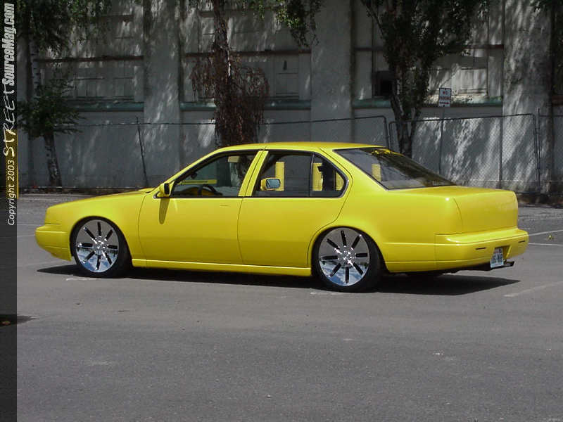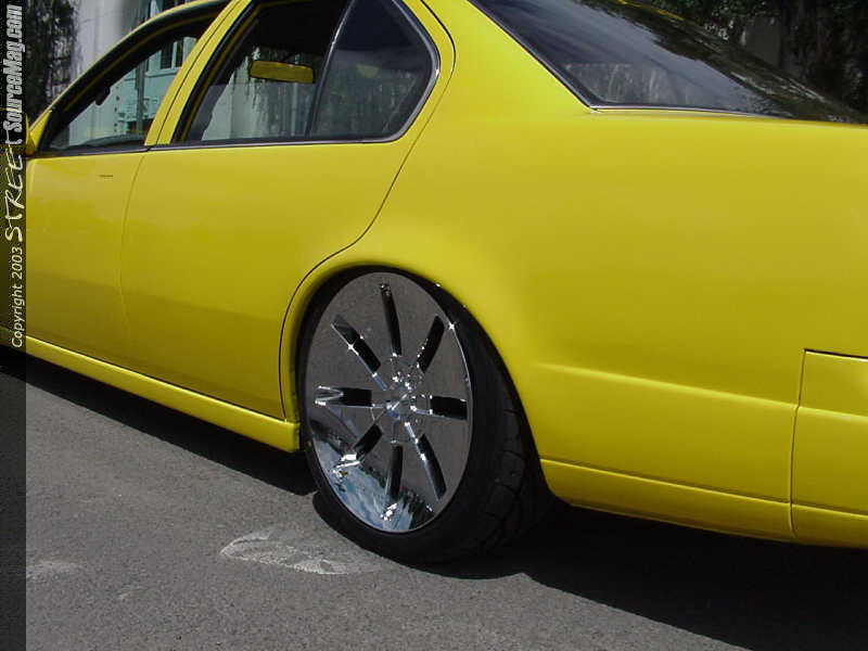 With the exterior complete it was time to bring things down to a much-improved level. The stock suspension would all be trashed and replaced by a set of refabbed Chassis Tech strut bags with fast valves to bring things up and down quickly. A front strut tower bar would also help keep things tight in the corners. Next the sub frame would be cleaned up and painted black. One more item at hand for the exterior would be the replacement for the exterior. A set of 18x8.5 Giovanna Barletta's, which have been wrapped in Yokohama Parada 225/40's would be Tom's choice of shoes. This would leave the interior to have reworked to Tom's standards. This would all be left to Jason Knauft of Bitchin' Stitchin', Spokane, WA. Jason would first start with the dash, which would be wrapped in graphite tweed along with yellow inserts. The doors would be done the same along with a coble stone look followed with a set of flames. Keeping things flowing, the headliner would receive the same attention. Other interior panels would be smoothed out and painted, including the rear deck.