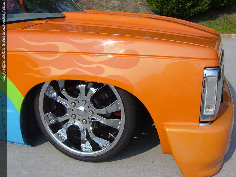 Now that bodywork was finished, which was all done by Mike and Steve Jolly from Faith, NC, it was time to lay down a few colors to make the truck an eye catcher. Steve Jolly takes the credit for laying down the PPG bright orange base with Porsche blue and lime green accents.  The full color scheme carries into the doorjambs for a perfect paint job. After finishing the paint job and putting it all back together, Mark still thought it was missing something.
