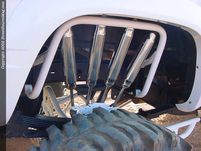 Knowing that low wasn't his preference, Chase decided to lift things instead. With a 12-inch Shiplash suspension lift and a 3-inch body lift, things would be looking up. Next to the suspension goodies would be a custom built set of flame traction bars along with4 custom-built rear blocks supplied with custom shock hoops. With the hoops in place, a set of Pro Comp shocks would be bolted up rear and front.