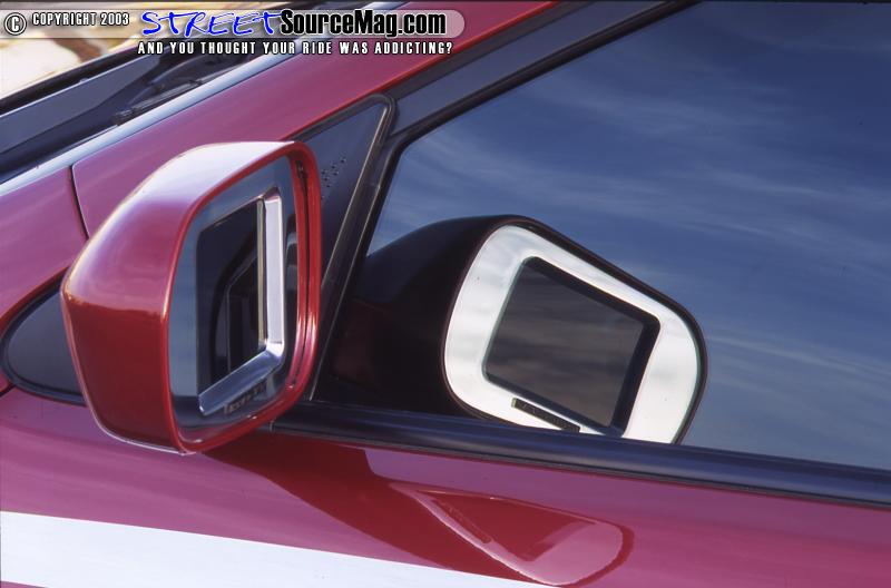 With the Kenwood head unit in place, and the audio running strong it was time to deal with other electronically components. For starters a Fahrenheit AVIR-3 video switching unit would be installed. Next, One Icon-TV 9" monitor (F90WIR) modified to fit in each rear quarter panel window would be put in place along with one Icon-TV rear view mirror with 2.5" LCD screen (RVCAM).   Feeling that wasn't enough video, One Icon-TV 5" LCD screen (LM500) would be placed into each side mirror. Finishing off the video, One 7" Icon-TV monitor (W-7000M) would be mounted in a custom "bridge" that hovers over the woofer enclosure. The bridge is made of MDF, fleece, resin, and fiberglass matting.