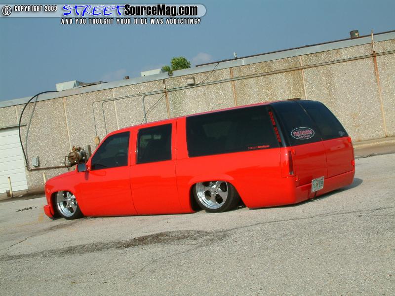 Jon started by calling his old friends Dacy Jackson and Brett Cox to get them sold on the idea that the Burban could be dragging body in as little as 10 days. So with them on board they began by taking the stock Burban that Jon had purchased from his mom and removing the entire front suspension. The factory coils were replaced with new Slam Specialties RS-72 bags. The factory spindles were then replaced with a drop spindle from Chassis Tech. Next they added a Monroe shock to the front to keep the ride as smooth at all times. Out back it was decided upon to cut the frame rails in favor of a C -notch to allow the frame and rearend to never have the ability to touch. The rear leafs were ditched in favor of a 2 link set up with a track bar installed to keep the rearend from shifting under extreme cornering. Another set of Slam Specialties RS-72's were installed in the rear to ensure plenty of lift. To ensure that the gas tank never had a chance to touch the ground Jon used the 20 Gallon donor of a Blazer, after it was powder coated to prevent it from rusting, and make it look better of course. To supply the pneumatic pressure the Burban needed to get things moving, (2) Viar 450 compressors were plumbed thru a 7-gallon tank. For that quick on the fly vertical motion Jon decided to install (8) GC Valves for individual corner control at all times.