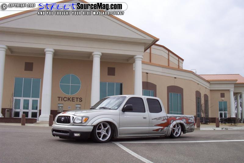 Jake called Clyde at Silver Star and told him he had always dreamed of building a new 02 Toyota Tacoma crew cab daily dragger. But see there was only one BIG problem Toyota only offered the crew cab 4-door version based on its ever-popular pre-runner and 4x4 chassis. So this left a big issue to be battled. First do you take it and try to get it to lay on pre-runner suspension or do you TOTALLY remove ALL of the pre-runner components and turn it into a creation that Toyota should have built from the start. Clyde decided that the best approach was to totally remove anything under the Taco that once resembled the factory pre-runner style suspension. Once the entire front end was removed the factory components of a 97 Taco donor were put into place. This allowed the Taco to take on a totally new looking life and a look that would change it forever. While the front end was tore down Clyde then used a pair of Firestone 2500 bags up front to ensure the truck would clear its new lo-profile rollers that it would receive once it was delivered to it's new owner. Now out back Clyde wanted to do something totally unique. Clyde started with a single 2600 Firestone bladder and decided to turn it into a custom mono-bag canti-lever design to allow the truck enough clearance in the rear. Clyde decided that while he was at it a 94 Toyota would donate it's rearend to the cause and allow the 4x4 prerunner suspension to be totally replaced with all 2wd components.