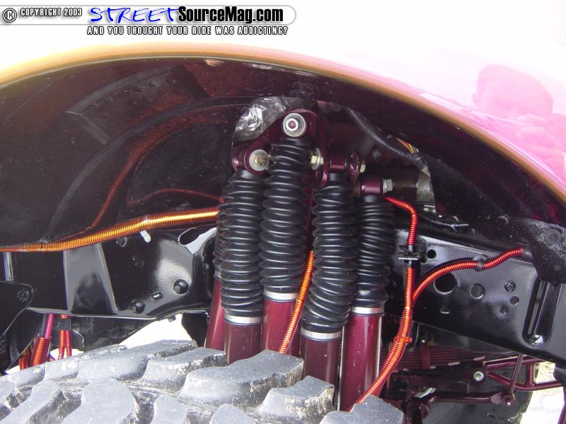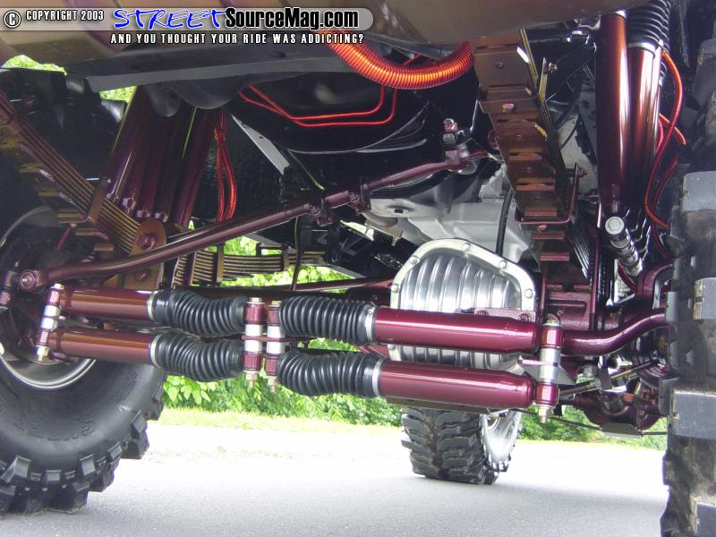 To stiffen up the suspension and provide better control for this heavy SUV, a set of 5-foot Fabtech ladder bars, both front and rear, were added. The shocks were swapped out for a set of 5 shocks per wheel all on custom mounts. There are now a total of 20 shocks. A 4-shock stabilizer system was also added to the front end. The 12" springs were painted to match the truck before they were bolted in.