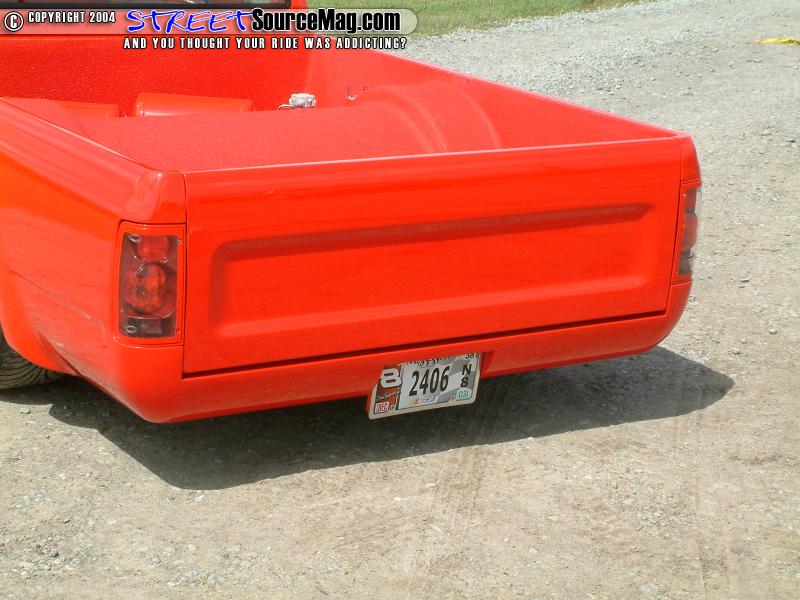 The gas filler door would then be shaved and moved into the bed while a set of Dimondback headlights would be bolted up along with APC Kandy red taillights. Trailer fenders would take place of the stock wheel tubs while the rest of the bed would be smoothed out and a ragtop cut and placed into the roof. Jamey would handle some of the bodywork while Don Bracken would help and finish the majority of the work.