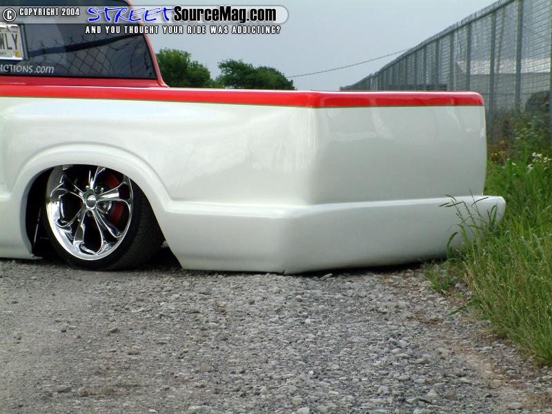 Next Jason would have the front and rear bumpers sectioned and a set of custom steel steps and roll pan welded into place. The doors would be shaved of the door handles and the gas filler door would be welded shut and gas filler moved into the bed. The taillights would be shaved and a set of trailer fenders would be welded in the bed along with the bed being completely sheet metaled for the over all smooth appearance.