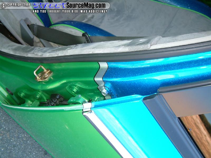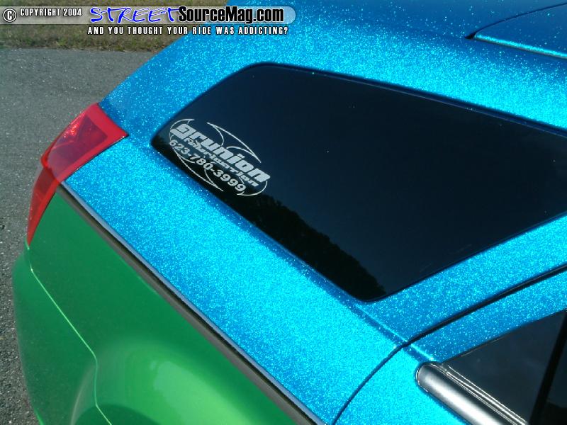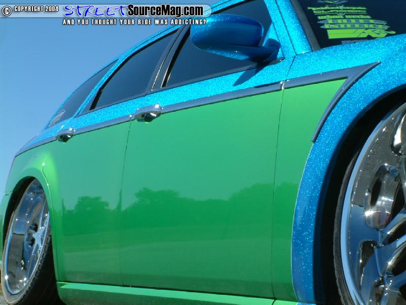 Keeping things rolling in the custom appearance Kris would turn to John once again for his paint expertise. This time around Kris would use an F22 HOK Royal Blue metal flake and lime time green two-tone design.