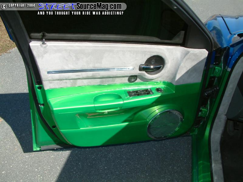 Next on the agenda for Kris would be a kick ass stereo set up. Keeping the same Pioneer in dash DVD/TV head unit in tact, Kris would build a new system around it. For starters 3 sets of Rockford Fosgate T162 components would be installed along with 4 Rockford Fosgate T1 10s. One Rockford Fosgate T2000.1bd is found pushing the subs while a Rockford Fosgate t800.4bd runs the mids and tweets. The use of a Rockford Fosgate 40 farad carbon capacitor,  2 optima yellow tops and all Fosgate wiring help keep the current flowing while 104sq feet of Rockford Fosgate dead skin through out the car help keep the sound in. The custom enclosure housing the subs would be a fiberglass enclosure also housing 3 18 inch blue LED tubs behind the amps and under the floor. Kris and Restricted Rick completed the entire Stereo install the night before SEMA.