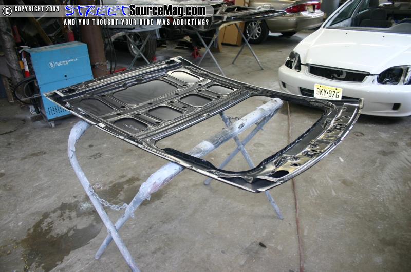 Lay the roof down where it needs to sit and make sure it is level. Next you will need to secure the roof to the car by using clamps. Do not make them super tight, just enough to see some glue start to squeeze out. Next pull out your welder or spot welder and spot weld the areas that you are able to.
