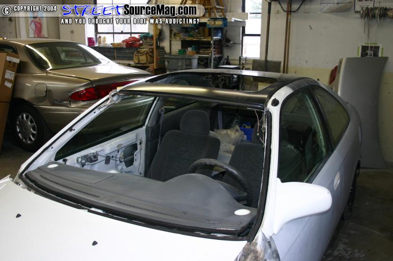 Grab an acid brush and the panel bond and apply it to the roof skin. I would suggest wearing gloves because the stuff can be really messy. Make sure that it covers the area you scuffed. Next grab a partner (this will take 2 or more people) and hold each side of the roof. Be careful not to touch the glue, or get your fingers caught in between the roof and the pillar.