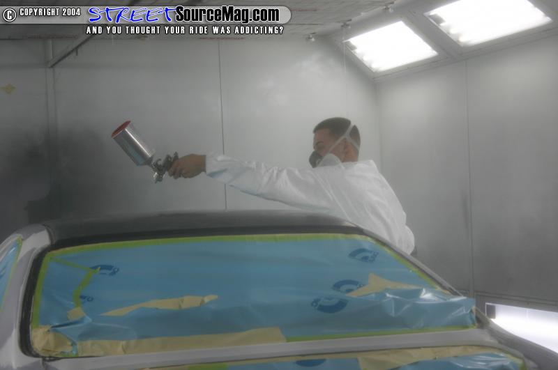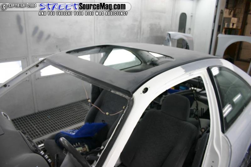 Next the car was pulled in the booth and taped up. After the car was prepped for sealer and paint I applied the seam sealer to the roof so that no water could leak in. After putting on my mask and mixing the paint I was ready to step into the booth. I first sprayed a few coats of Standox Sealer to the roof and let it dry. I then based out the roof with Dupont Taffeta white, and then cleared it with Dupont clear. The car was then baked. I wet sanded the roof with 2000 wet and buffed it so that it had a nice glass appearance. I then hand glazed my whole roof. The roof that I chose to use had factory sunroof in it. I reinstalled the sunroof, and attached the drain tunnels. I then called our friend Mike from Glasscar windows to reinstall the windows. After the windows were back in the car I put the interior back in and the car was now finished.