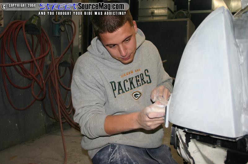 In the booth I sealed both quarters and tail sections. I then applied 3 good coats of base to each quarter section. Last I applied 2 good coats of clear to the quarters and then baked the car. I used all Dupont materials in the booth. When the car was done I pulled it out of the booth and left it over night. The next morning I wet sanded the whole quarter and tail section with 2000 wet and then buffed the whole quarter.