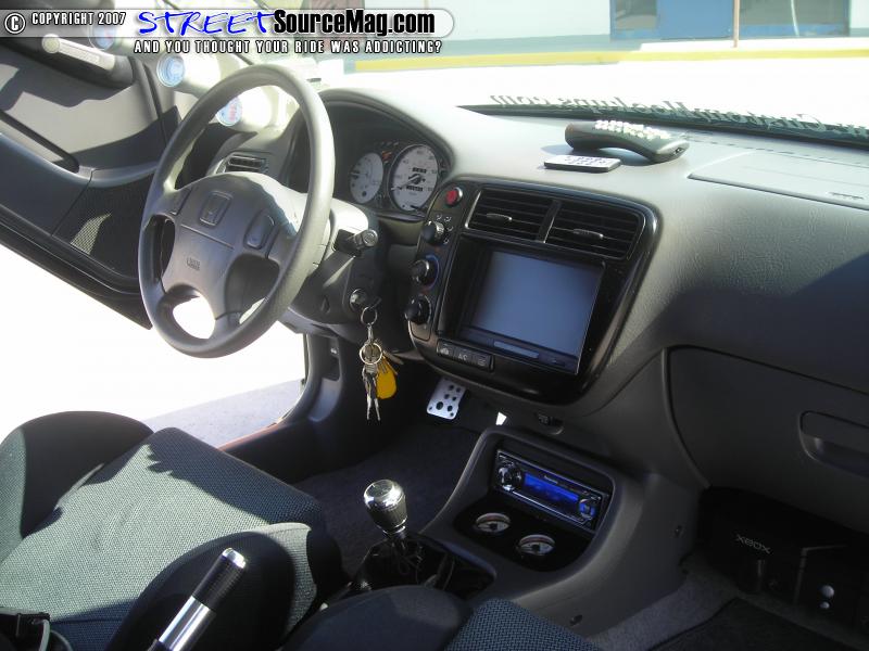 The custom work continues on into the interior. Black and gray Tenzo R racing seats were put in place of the boring stockers. The rear seat and doors were then upholstered to match and CIVIC embroidered into the backseat. Brad then installed a Panasonic CD player along with Audiobahn AW12002 subs and Pioneer mids and highs. Powering this setup is a 12001DT Audiobahn amp and Stinger battery.