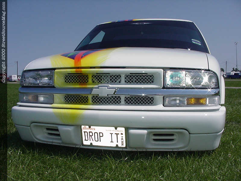 Next, Rob’s S-10 was taken to Dennis Virgil of St. Louis, Missouri to get the wild graphics laid down. Utilizing 41 different colors, Dennis went to work painting in a total of 120 hidden skulls, in the mix of all the tribal graphics and flames. Also within the graphics you’ll find Cheetah print, snakeskin and water tide swirls. Dollar signs also can be found within the graphics. What really sets off Rob’s S-10 is the fact that this truck is double sided. The graphics are different on each side, which allows you to look at it closely for hours to see all the visible and hidden graphics. The graphics also were painted between the cab and bed for a true custom job.