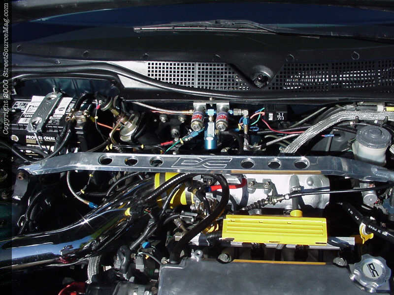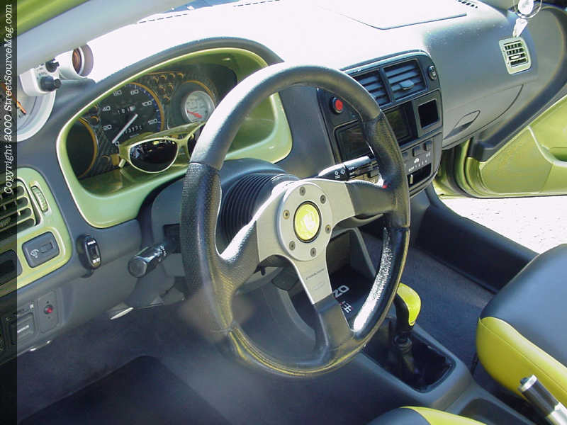 To roll the civic around, Angi went with a set of chrome ICW 17” wheels wrapped in 205x40 rubber. Since the import scene is big on speed, Angi knew she wouldn’t be able to leave the engine alone. So to move the civic down the road it was time to hook up the engine. With this in mind many add-ons were required. To get things started AEM adjustable cam gears were installed. To get the air flowing, the decision was to go with DC Sports 2 1/4 –inch cat back system along with a DC Sports Header.