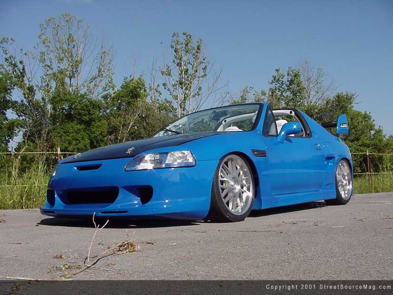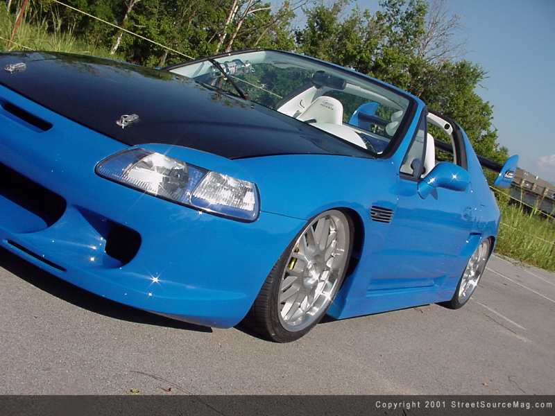 Knowing what he was wanting, Donald decided putting out $12,500 on a Honda Del Sol would be well worth the dollar. So back in January of 2000, the money was spent and the beginning of a whole new dominator of the sport would begin. Although this journey would take about a year and a half to build to this point, as we all know it will never be done. Donald knowing his way around the shop would make the complete customizing of the Del Sol a process that would move at a fairly quick pace. With help from friend Mark Ramirez, the body would be first on the long list of modifications. Working the front would top the list with some modifying ideas new to the Del Sol scene. With custom mounting a set of 1997 Honda Civic headlights, a custom carbon fiber hood would be bolted up with chromed hood hinges to match up to the head lights much like a stock fit. With a Kaminari front bumper customized to fit with the new headlights and also giving the already sporty Del Sol a meaner look. Buddy Club side skirts and rear bumper would be mounted to complete the body kit for an over all aerodynamic stance. The grilles found in the front of the Del Sol would be chromed along with the windshield wiper.