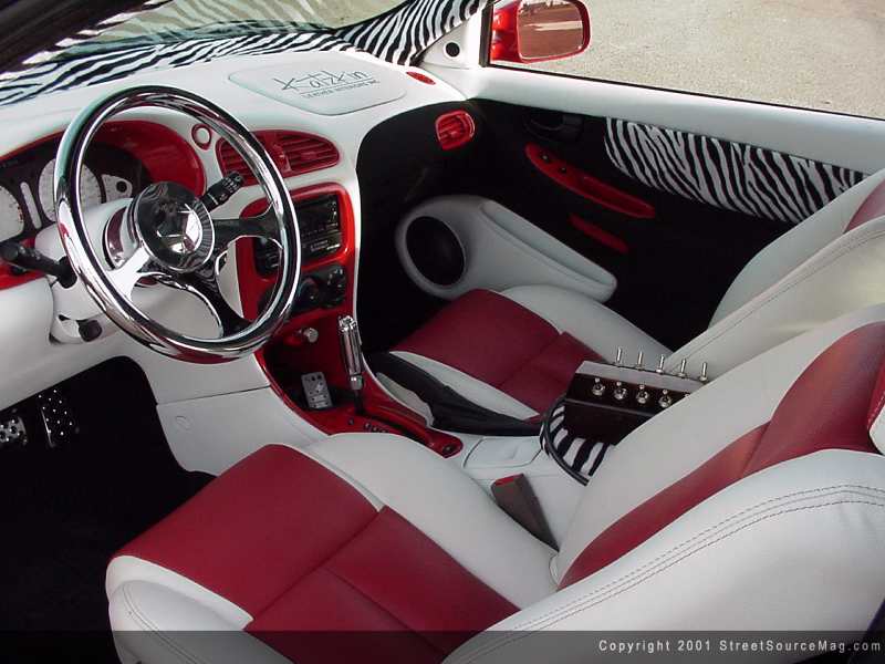 The center console was also dyed red and white and outfitted with black tweed and Zebra skin print.   Billet Accessories Direct provided a one-off billet steering wheel and custom-made white face gauges adorn the dash of Robbie's Alero. Also adding appeal to the dash, the vents were removed and painted Fire red to match.