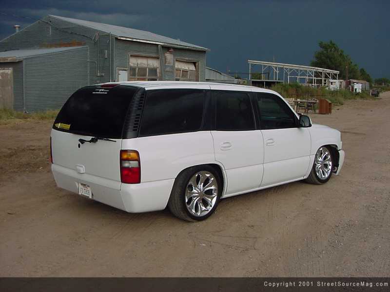 With the grill now taken care of, something still didn't look right for this Yukon so Craig decided to have the front bumper painted to match and shaved the tow hook holes. The headlights from a Denali where installed to help bring the front of this beast to the way you see it today. Out back Craig and the guys at F/X junked the bumper for a steal roll pan and a custom built hidden hitch to pull the toys around with. As for exterior paint Craig kept it pretty much stock except for painting the door pillars black bringing out the all glass appearance.