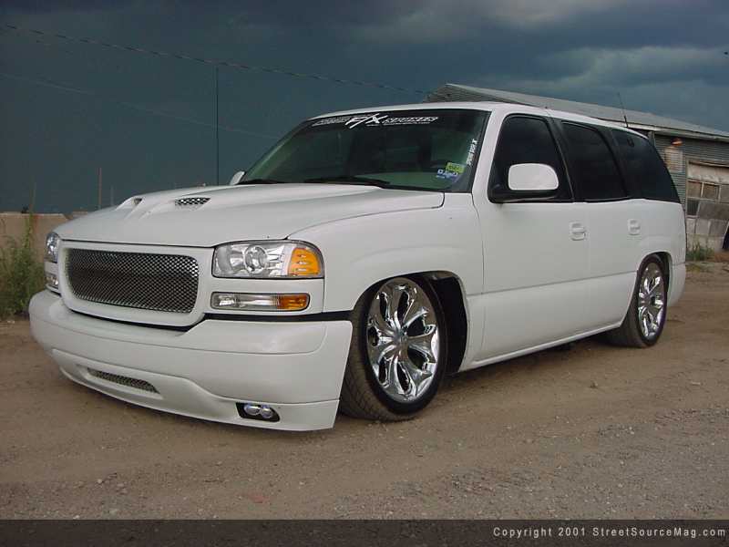 As for suspension the guys at F/X really took care of Craig. First off F/X ripped out the front coil springs along with the shocks and replaced them with firestone airbags. To help smooth out the ride, a set of ground force shocks where relocated. Moving to the rear F/X modified the factory 4-link and installed 2 firestone airbags to give the Yukon a tough laid out stance when deflated. To get this beast up and down F/X installed Grainger valves, 1/3 horsepower compressor and two 5-gallon air tanks all hidden well underneath the SUV.