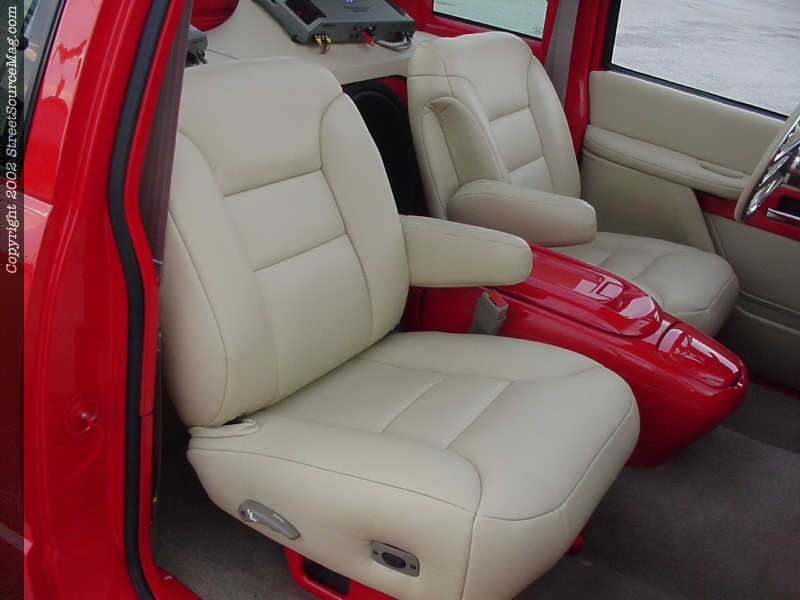 All other interior panels where painted red to match the dash and to bring everything together. Wanting new seats, Jimmy would install a set out of a 1998 Tahoe. The seats would be installed and reupholstered in the same ultra tan leather along with the head rests being removed. The seats where stitched up by Tracey Morris of Pocola, OK. The stock steering wheel was then replaced with one that was supplied by Budnik to help finish things out.