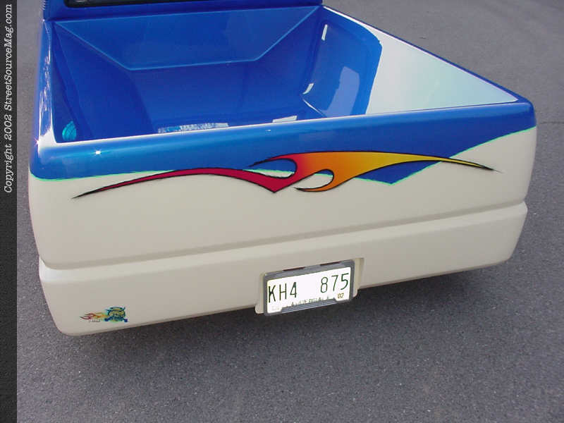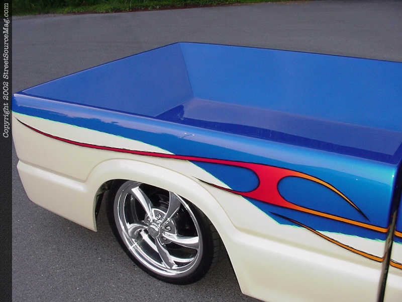 The next order of business on Andrew's agenda was a complete outside makeover. Andrew knew exactly what he wanted to do, so he took matters into his own hands in this department. First, Andrew shaved the door handles, wiper cowl and body line. Andrew also shaved and smoothed the firewall and taillights.   The gas filler neck was relocated inside the fender and the gas door shaven clean. The factory Mazda bumper was tossed in the junk pile and replaced with a steel roll pan.