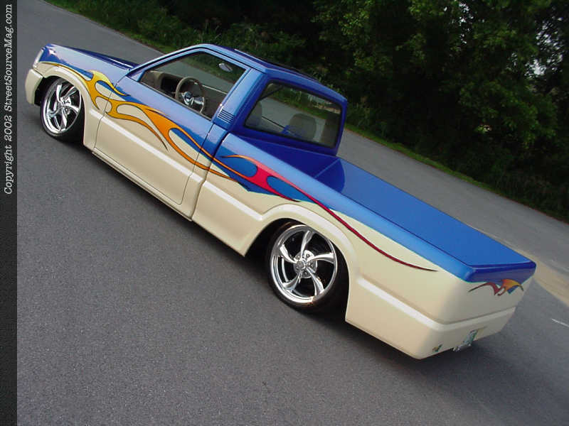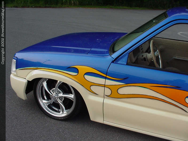 With everything shaved and smoothed to Andrew's tastes, he delivered his truck to Denny Phillips of Meridian, Mississippi for color. Denny first applied the House Of Kolor Trublue and cream two-tone, then gave the Mazda more life with House Of Kolor Magenta Pearl and Sunrise Pearls flames. Denny the used a shade of green to pinstripe and bring life into the color scheme. Generous amounts of clear were then sprayed and Andrew's Mazda was finally starting to take shape.