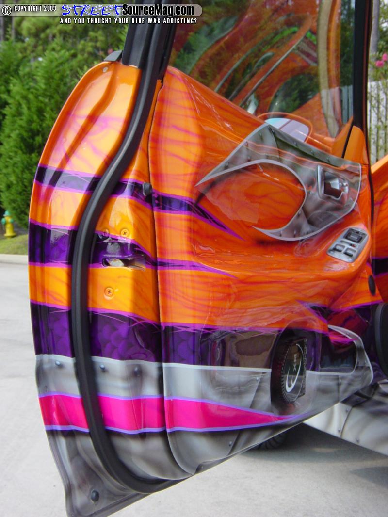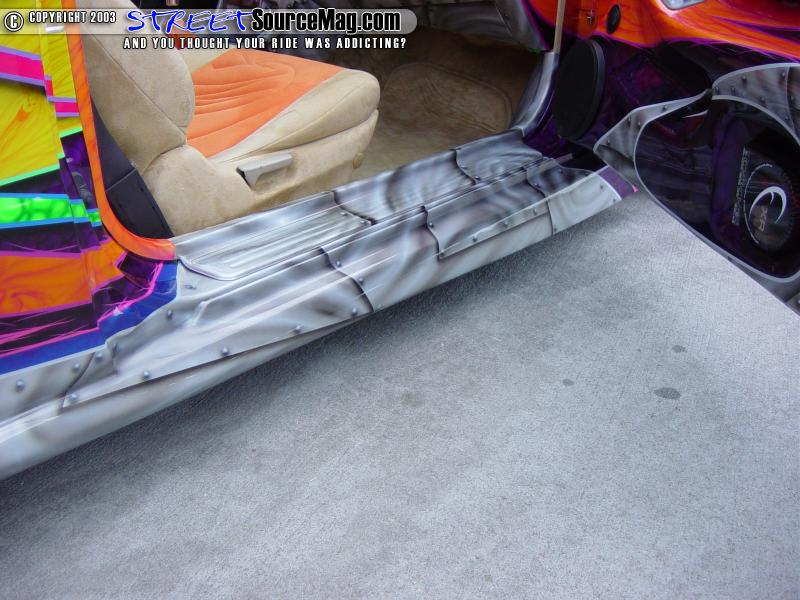 The graphics flow perfectly from outside, through the doorjambs and into the interior. The graphics coming up the hood flow nonstop across the dash as well. There were also a few pieces painted like armor plate to match the armor plate paint on the bottom of the car.