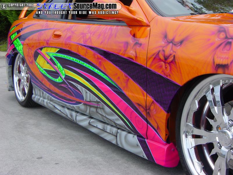 Now here is where Jonathan REALLY set his car apart from the rest. Most people would stop here and decide the car was ready to show, but not Jonathan. In order to guarantee he would bring home several best of show awards, he decided to carry the paint scheme to the entire undercarriage of the car. The entire unibody and sub frame were stripped and painted purple with orange accents. The gas tank was painted like sheet metal screwed together. The sway bars were powder coated before they were reinstalled. Every bolt on the undercarriage was coated and reinstalled. This shows that Jonathan went the extra mile not to leave ANY bolt on his car untouched. Now after looking at a car like this you would assume it's a trailer queen. That's not totally true in this case.