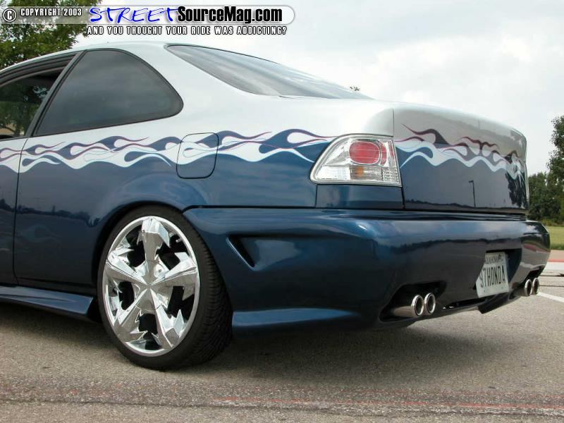 Now, Doug didn't care for the natural headlights, which is why he upgraded to the APC after market headlights and taillights for a perkier look. Then, turning to the crew and Jason Hughes at Street Dreams in Tulsa, Oklahoma, the Civic was given a finish of mesmerizing Lexus blue paint accented with blue and purple tribal flames. To complete the transformation he also continued the blue and purples throughout the tweed interior. With that kind of nip and tuck, it was time to give the ride a few more helpful mods to ensure it was everything Doug had had hoped it to be.