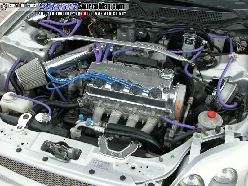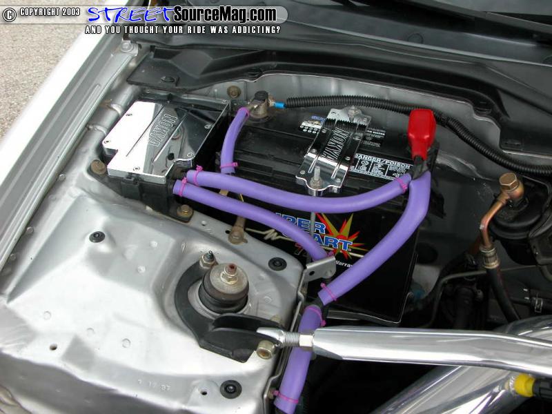 He outfitted the engine with a valve cover, chrome dress up kit and a purple hose kit. Also wanting to give that head turning edge he went for the DC Sports chrome header, intake, and dual exhaust set up to ensure this ride was dressed to impress.