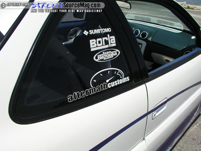 Now that the body was in righteous order it was time to shift focus and tackle the next task at hand. Eibach springs were installed on all four corners to bring the altitude of the entire car down two inches closer to Mother-Earth.  KYB Struts were then installed to smooth out the rough LA roads. High Rev Motorsports was then called upon to supply one of their upper strut bars to tie the front end together under hard cornering conditions. Now with the car sitting were it belonged it was time to replace the factory no frills wheels with some Racing Hart CP-035 18" white wheels shod in a 225/40/18 Sumitomo skins.