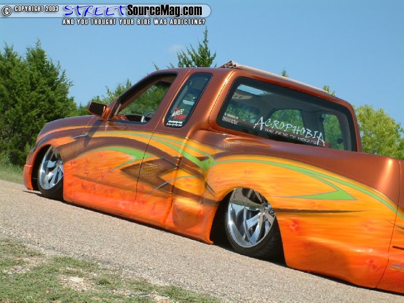 To compete in this industry you have to have knowledge of what people like to see when thumbing through magazines or walking the shows. For David this vision was simple, big wheels on big bodies laying flat on the ground. So to come true with what was wanted he would first drop the F-150 off to Anthony Rhodes of R.A.W. While in Anthony's hands the frame would first be boxed and reinforced.  He would use one of his RAW notches to allow plenty of clearance for the rear end, which had been narrowed 9-¼ inches. Next the driveshaft would be taking to Advanced Driveline of Orlando, FL where they would cut it down 1-½ inches for proper alignment. To help bring the big Ford down, Anthony would build a custom rear bag set up allowing the bag's to go through the frame for ultimate low. Finishing off the rear a custom triangulated 4-link would be installed.