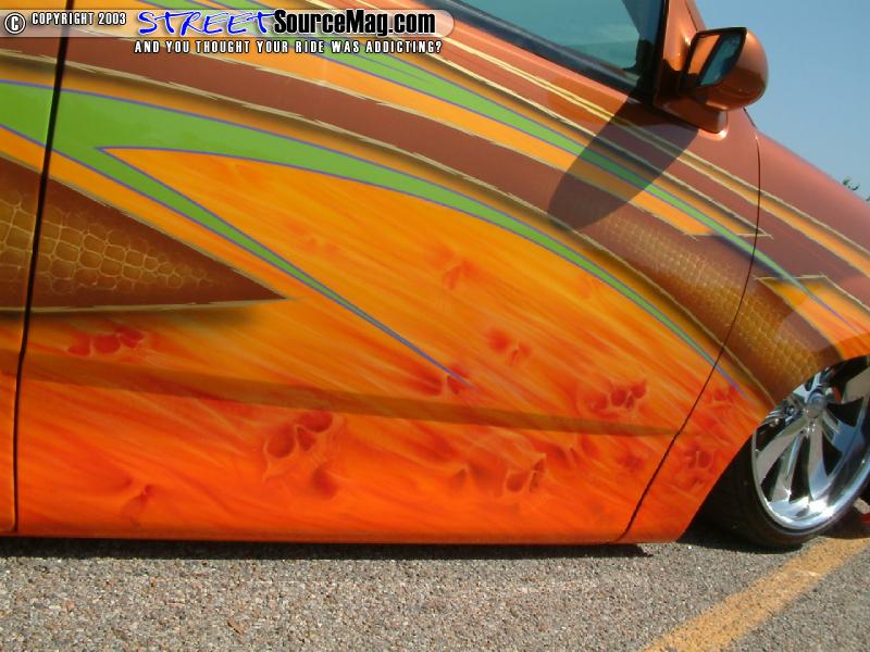 With the exterior prepped and ready for paint David would take it to Todd Fisher of Deland, FL for his paint expertise. Todd would pull out many House of Kolor paints to complete the look David was envisioning. Cinnamon pearl would be the base color along with Sunset, Tangelo, Chrome yellow and lime green in the form of some killer graphics.