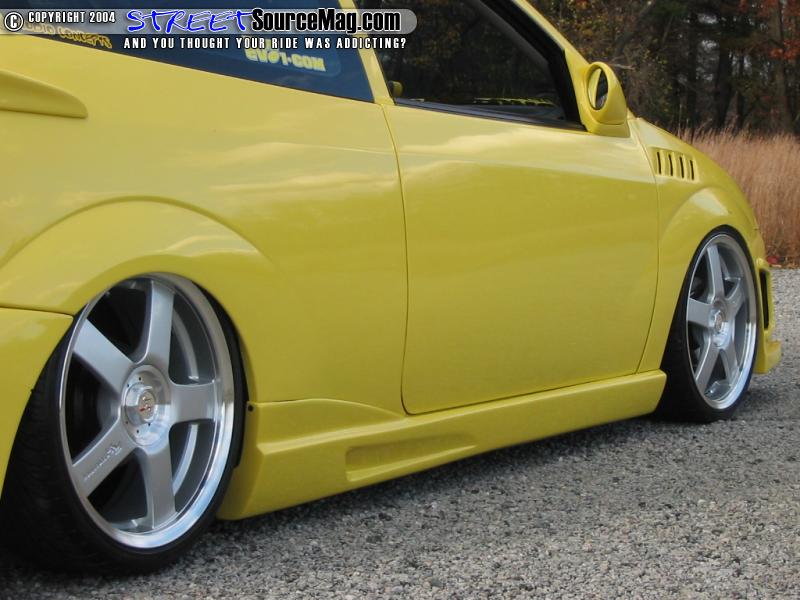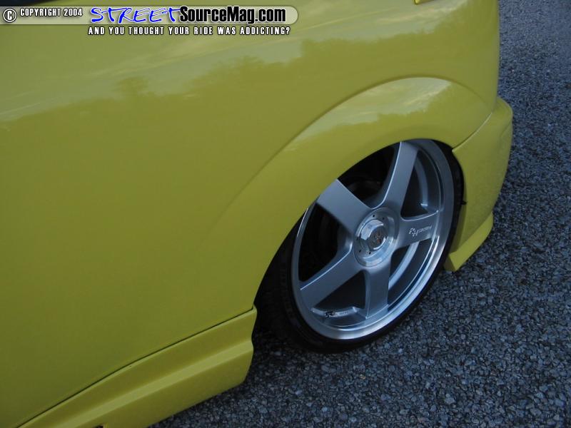 The exterior was fitted with a Nopi fiberglass hood, Aerogear Z3 fiberglass fenders, Black Widow 2 front and rear bumpers, and Wings West side skirts. Factory European headlights where installed along with a ‘02 Euro Grille.   The car would be shaved of its door handles, gas filler door, moldings, hatch, and upper bodyline. The gas filler door was moved to the Hatch Jamb.