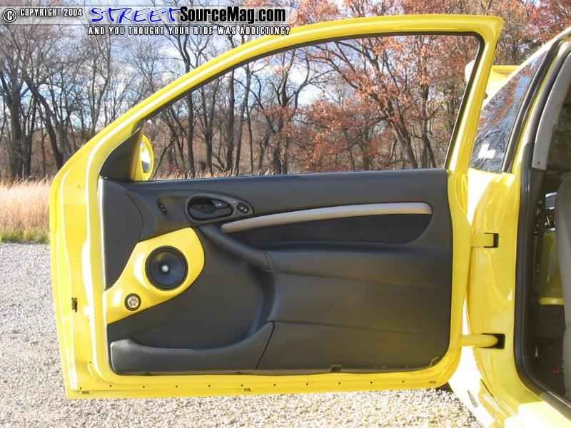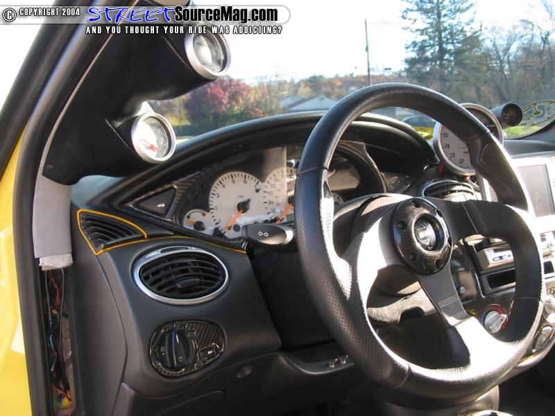 The interior was fitted with carbon fiber, fiberglass and painted panels. A custom fiberglass enclosure was built in the rear of the car to encase the Audiobahn subs, and amps.