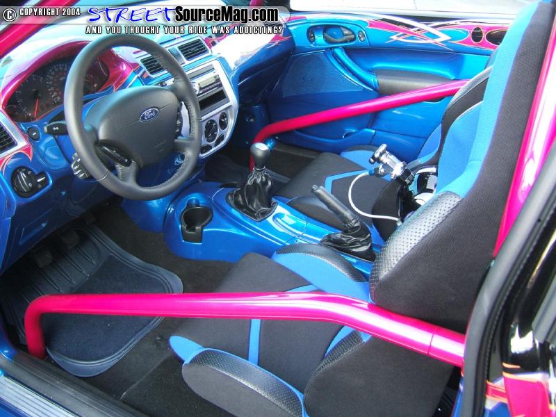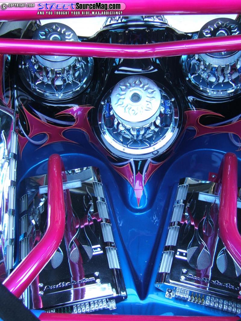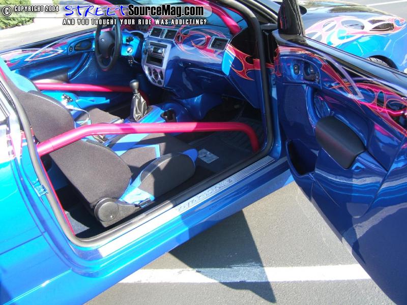 Next a fully fiberglassed dash would be set into place along with door panels, rear cargo area (which involved glassing where the rear seats where located) and a custom painted roll cage. Specialty Designs billet doorsills and center dash inserts would also be installed. Not yet complete Kyle would install a full Audiobahn Flame Series Stereo Setup in a custom fiberglass enclosure painted to match the exterior graphics.