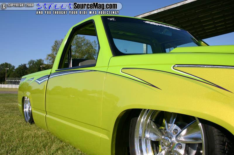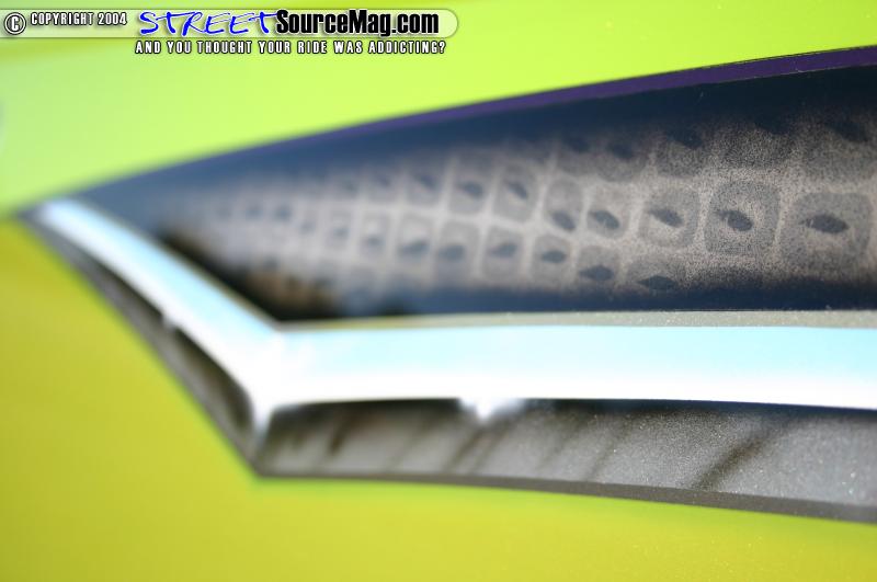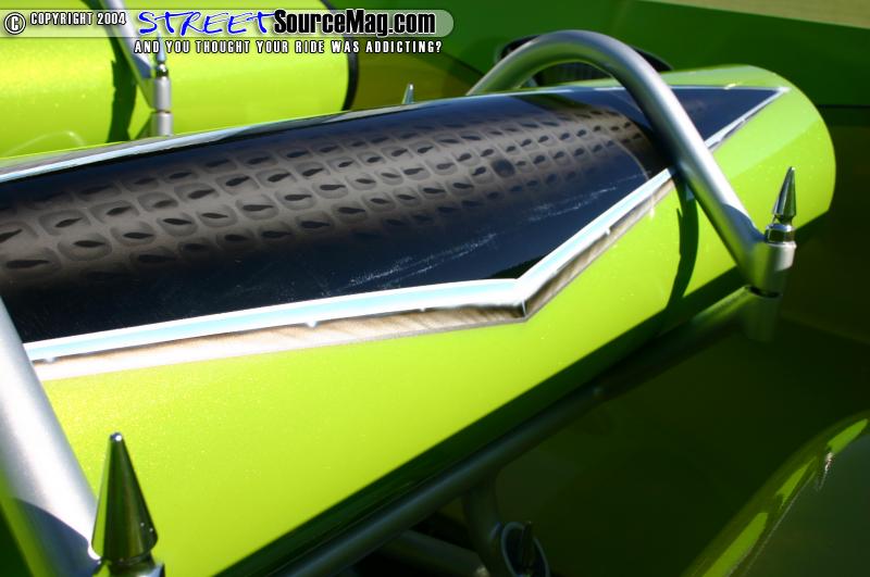 Mark laid down the Tequila gold paint on the bottom and Sour Apple paint on top. He then airbrushed a chrome graphic with gator style airbrushing inside of it. The paint was then stripped in laser purple and cleared.