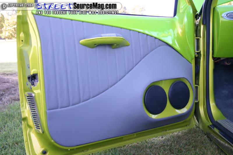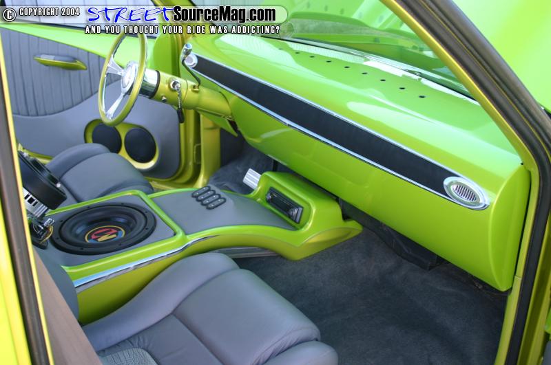 The seats are out of a Fiero and are wrapped in gray gator and leather. Coachworks did all the wrapping. Marks interior also features a Billet Specialties steering wheel, Trenz billet mirror, bullet hot rod vents, and a custom fiberglass console housing the switches and amp. The stereo consists of a Pioneer head unit, Boston Acoustics mids and highs, two 10” Memphis Audio M3 subs, and a Soundstream class D amp.