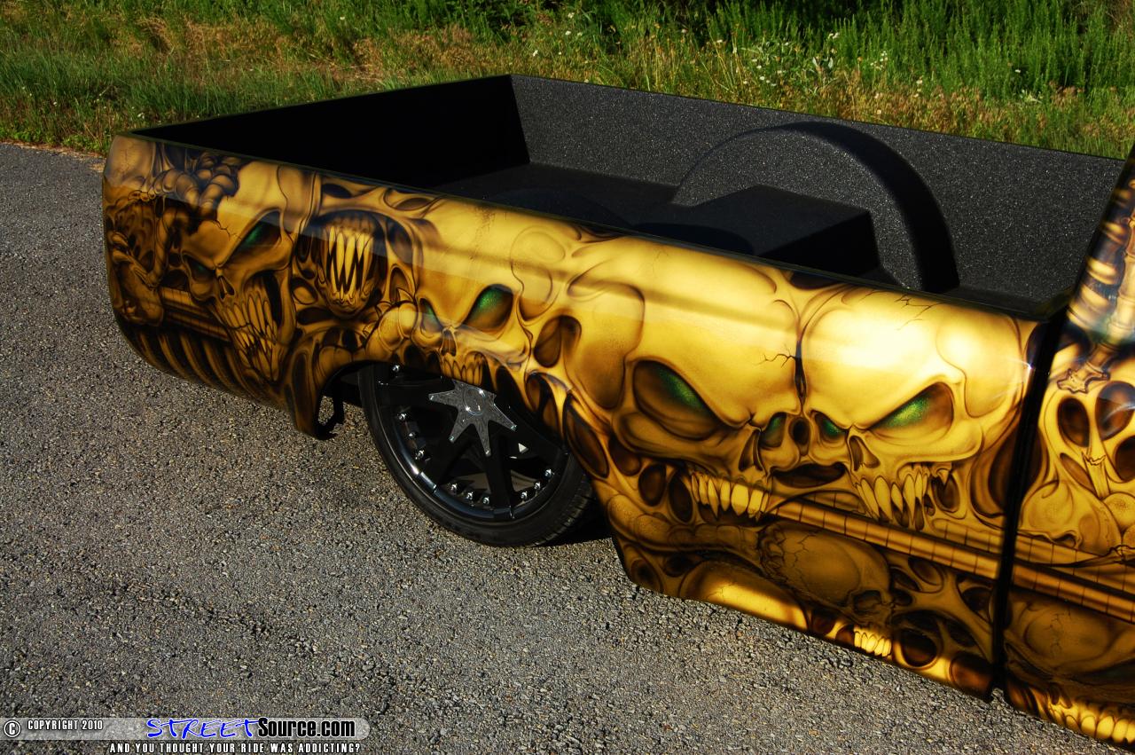 When it comes to setting your sights on the cover, your paint job really has to grab some attention. With this as his goal, Kyle set out to blow everyone away. Before the paint hit the truck, another crew of tight-lipped friends were assembled. Starting out with a Toyota 4Runner front end, Kyle and his friends Steve Faston & Josh Zumwalt proceeded to shave everything they could, even rounding the bed corners to be as clean as possible. A hole for a 40x40 rag top was cut and then it was time for some paint. The base coat and clear were handled by Jon Wiggins of Creative Classics. The airbrush was wielded by Jonie Nichals also from Harrisonville, MO. You can see this truck several times and still catch something in the paint you missed every other time you looked at it. The interior of this wicked truck was the brainchild of Kyle himself. Wanting something truly evil looking, Kyle built a fully one-off interior using rolled steel and whatever could be found and integrated them into the theme. Once the fabrication was done, nearly everything was covered in spray on bedliner from Ameriguard. The dash features Dakota Digital gauges so Kyle can keep tabs on his speed and everything else. What would an evil truck be with a factory four-cylinder motor? NOT EVIL. With that in mind, Kyle shoved a Chevrolet 350 engine under the hood complete with a mild cam, Holley high rise intake and Edelbrock 600 carburetor. Joey Bails handled modifying the 700r4 transmission that keeps Kyle cruising this truck down the highway. Kyle would like to thank Guilty By Design, Tim's Muffler, Ameriguard of Lee Summit, Creative Classics, Robert's Tire, Solor Pro, Clint's Alignment, Bob Sipes, Josh Zumwalt, lil Kyle, Jon Knap, Leon Bearce, Jon Wiggins, Jonie Nichals, Steve Faston, Jamie Taylor, Pig, CJ, Henry at Automotive Again, Shawn Yoss, Mike Baker, Fake Uncle Doc, Dale & Evlyn for the garage space, Mom & Dad, wife and daughter as well as anyone else he forgot but answered their phone when help was needed.