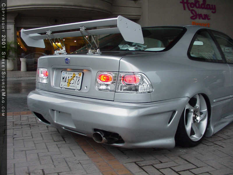 When it comes to capturing attention, one must have the look of their vehicle built with taste. Well to manage this feat, Lemwell decided to bolt up an Andy’s Autosport Combat body kit to give his civic the aggressive look he was wanting. While laid out, the kit is just a hair from kissing the ground; this Civic will grab anybodies eye. To compliment this phat body kit, the ultimate decision was to bolt on a Aluminum wing which was purchased from VIS.
