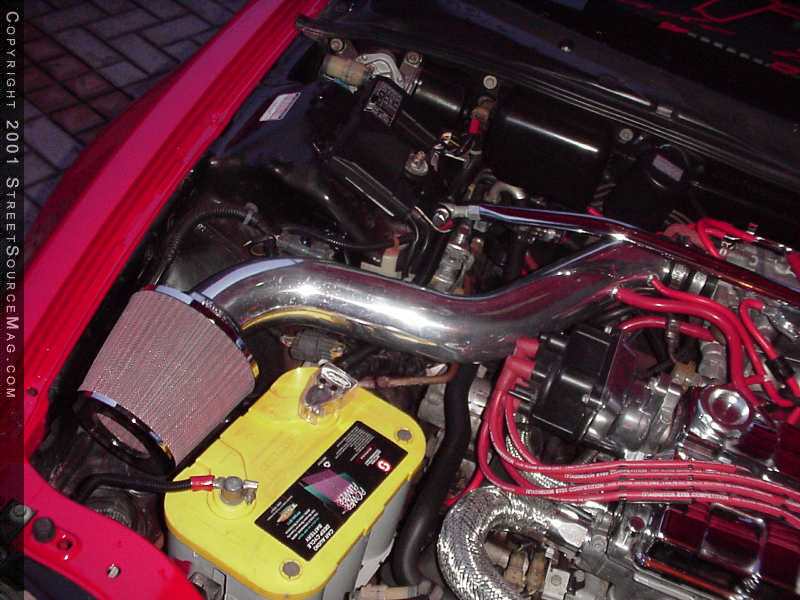 Think that is about it? Well I believe tires would make a difference as well. So to handle this task, a set of 17-inch 5 Zigen (painted champagne) rims wrapped in 205/40 Falken’s, which had to be mounted up. So, that leaves us to one last item to discuss. The engine. When we talk about show rides, on most of the nice cars, the engine bay stands out above the rest. Well, Chris lives up to that theory. With a chrome valve cover, brackets, distributor, and chrome STR fuel rail, the engine bay shines.  To help out the clean look, most all of the wires were covered in either silicone or steel braided hoses. Some more products for fashion would be a polished Focuz intake system.