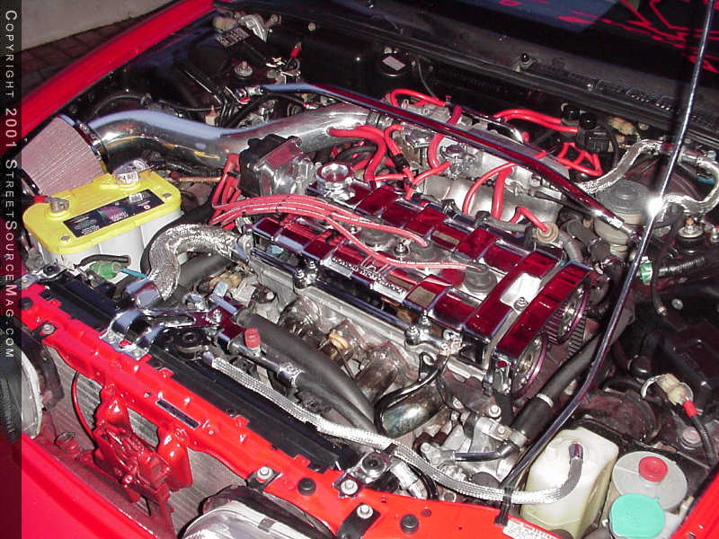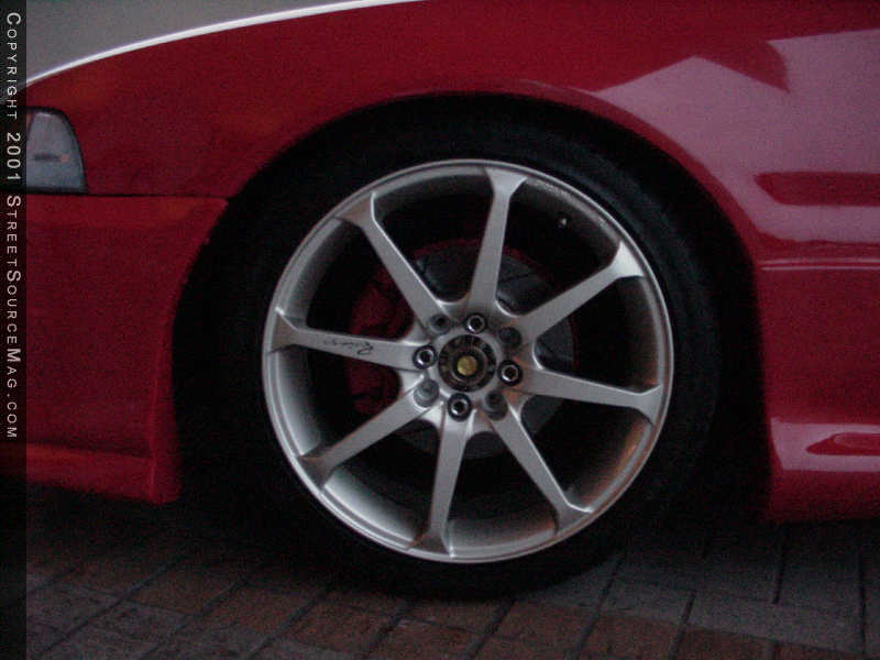 With the import scene, you must have killer suspension to handle a day at the drags or the mountain and coastal drives through wavy roads. In this department Chris made sure not to hold anything back, just like the rest of the car. The products of choice would be a set of Tokico shocks along with V-spec coil-overs to give the best ride possible. To help stiffen things up, a Suspension Techniques strut bar was installed. Now that he can dive in and out of corners, he must have some way of slowing down. In order to do this, slotted stainless steel rotors where installed along with Goodridge stainless steel brake lines.