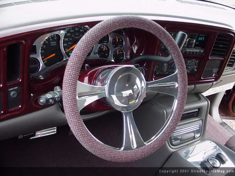 With the air-ride gauges being covered in billet along with the control panel, that would leave only the flamed billet mirror to be named. To accompany the array of billet in the interior, a Weld CTX 01 steering wheel would be installed.
