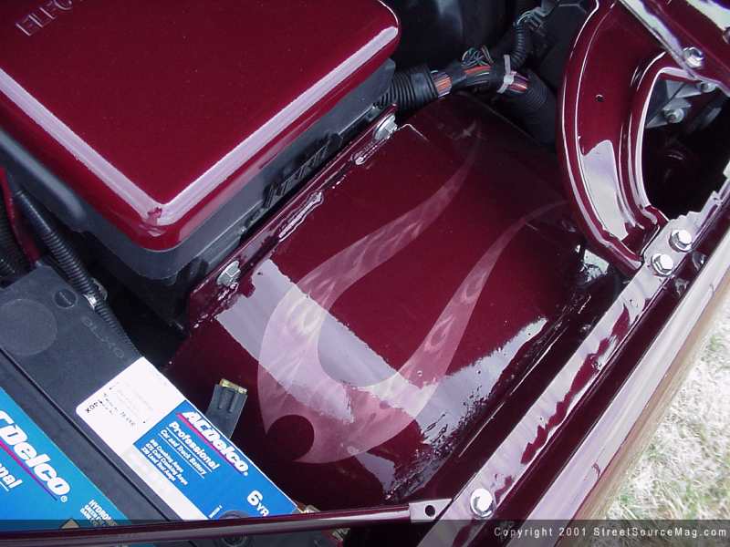 Beefed up with an Airraid custom intake and Hypertech re-programmer, the engine would need a little help breathing. With a new 3-inch exhaust mounted with a Flowmaster street muffler, the beast of a step-side would respond on demand. Living in the Texas area and being a heavy-footed driver, Shawn also had an electric fan mounted up.